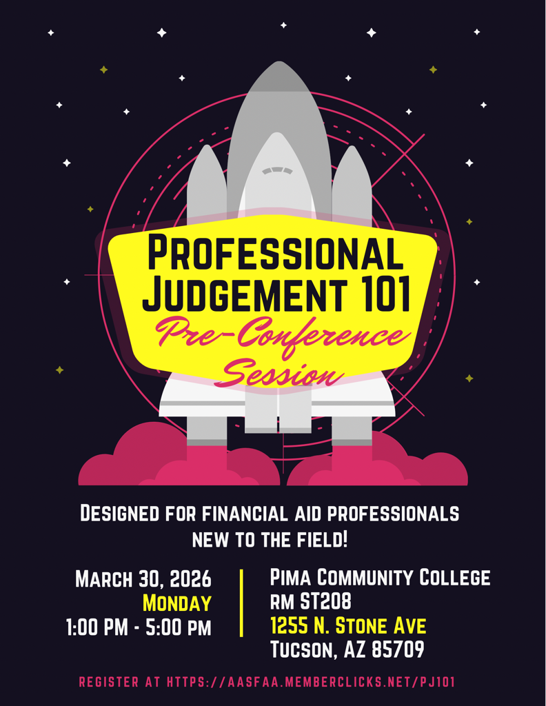 Conference Pre-Session Training Date: March 30, 2026 Location: Pima Community College, Downtown Campus in Tucson, AZ Cost: $50 for AASFAA members/$100 for Non-members Pre-Conference Training Session Registration - Open Now!
